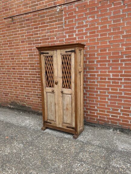 Alacena o armario antiguo estilo rustico Realizado en madera de pino con acabado madera lavada. Medida : 80/35/ 154 de alto. Herraje metalico , tiradores de madera , 3 baldas, celosia parte de arriba .