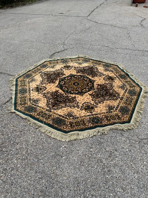 Alfombra clásica octogonal. Medida 160 diámetro Realizada en lana Remate con fleco beige cosido. Color verdes