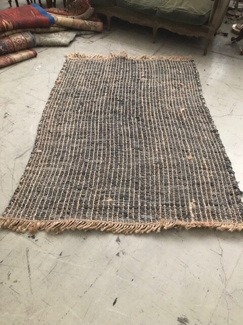 Alfombra realizada en yute teñido color azul y textil azul entrelazado.