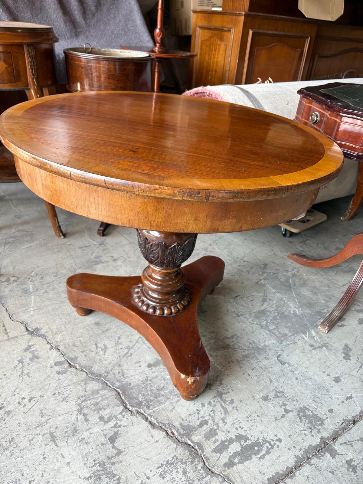 Mesa antigua pata central. Origen francesa. Realizada en madera caoba con marqueteria en tapa.