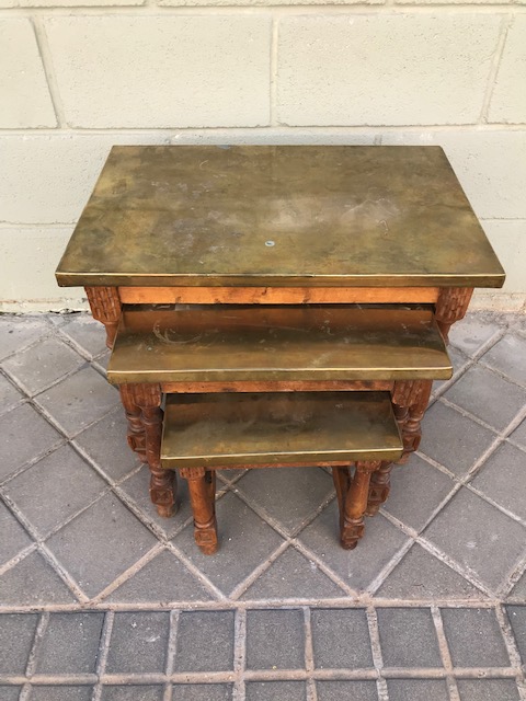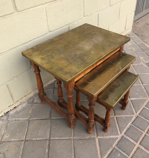 Juego de tres mesas nido. Realizadas en nogal con tapa chapada en laton dorado. Años 70 .