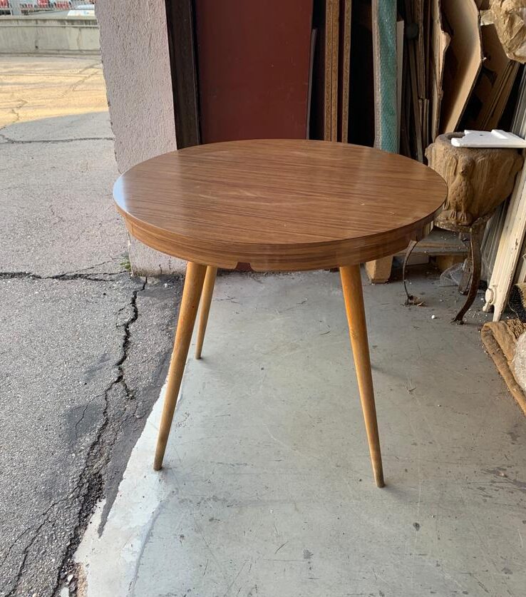 Mesa de comedor vintage Realizada en madera estructura y patas y tapa tablero melamina de origen con pequeño faldon. Epoca años 70 orignal Medida 80 Diametro y 72 altura