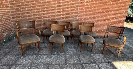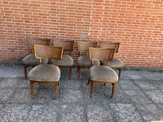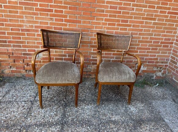 Sillas originales estilo nordico Epoca años 50 Restauradas y tapizadas Pieza muy especial. Realizadas en madera de roble con respaldo rejilla y tapizado chenilla en asiento.