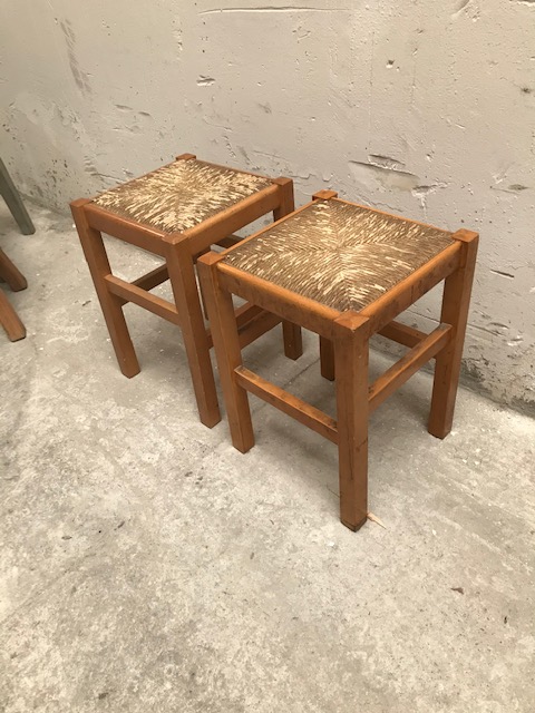 Taburete vintage típico cocina años 80 Madera de pino con asiento enea.