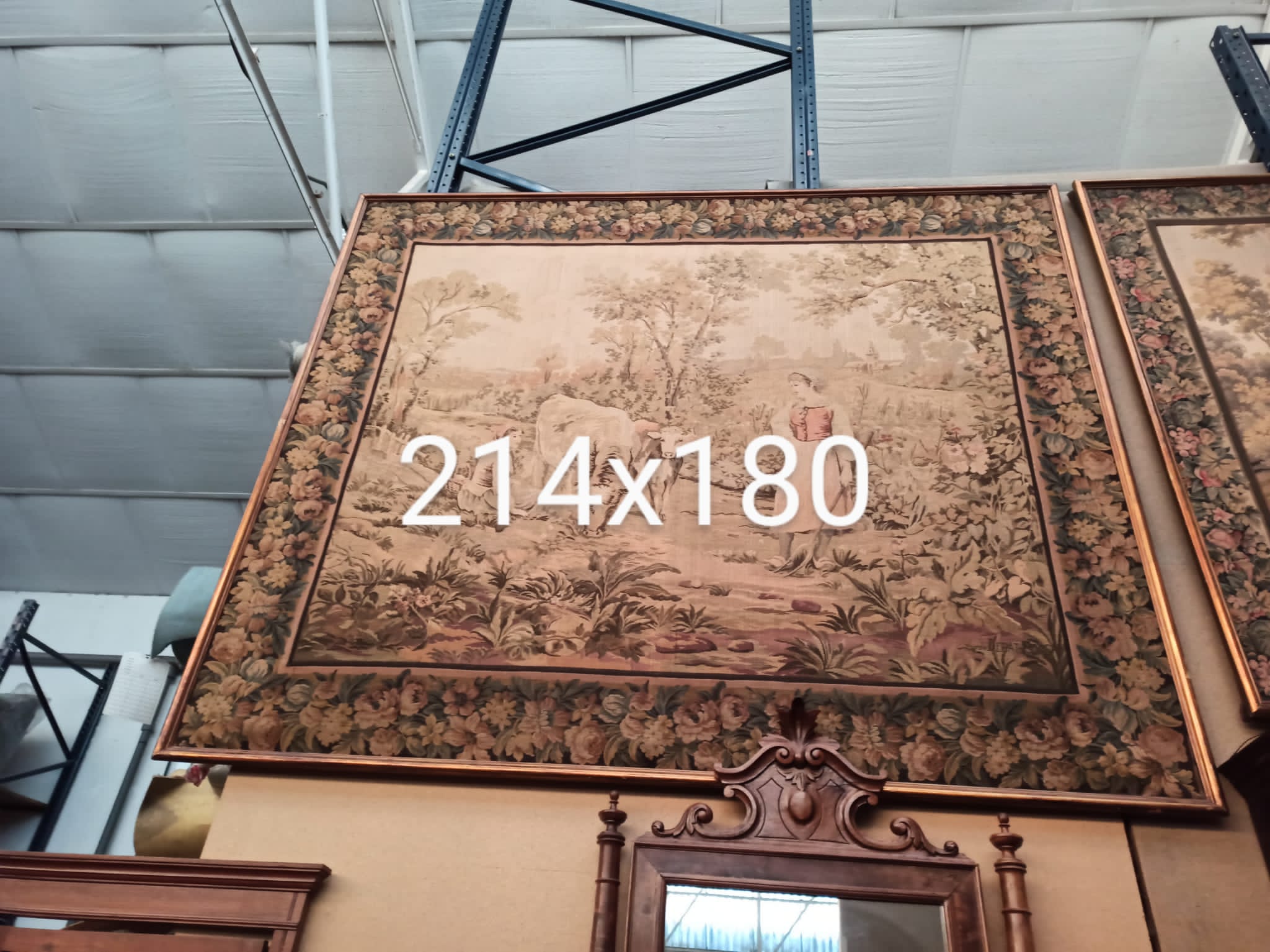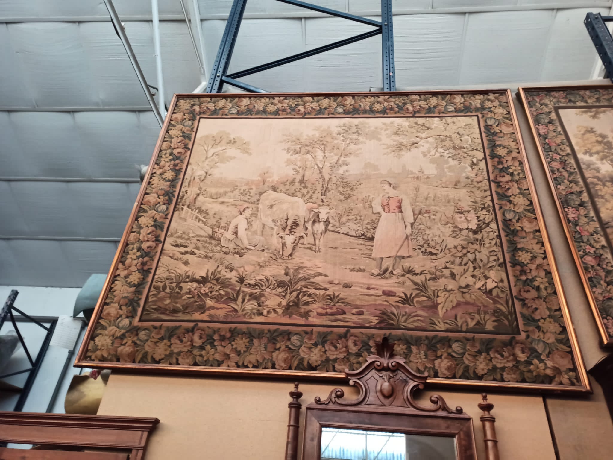 Tapiz antiguo Escena exterior paisaje con dama y conjunto vacas. Origen francesa, tejido mecánico XIX, con greca perimetral
